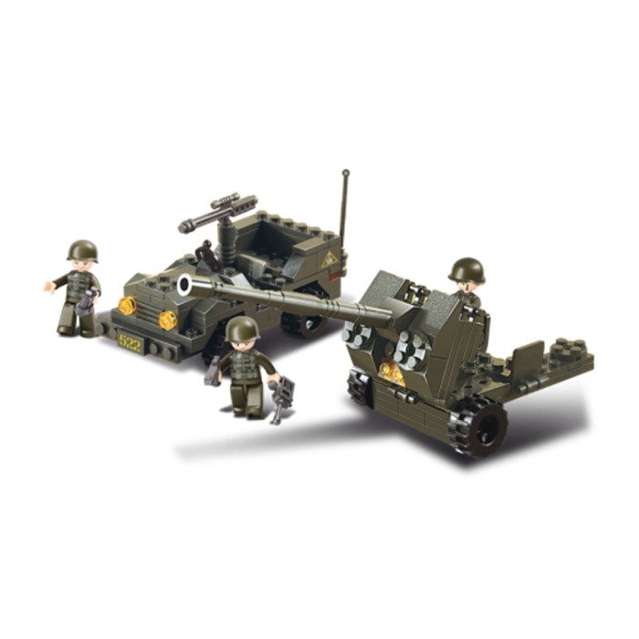 Houd iedere tank tegen met het Sluban Antitankgeschut. De Jeep en en het afweergeschut worden bemand door 3 zwaarbewapende militairen. Sluban bouwsteentjes passen op andere merken bouwsteentjes. Dit bouwset is het ideale cadeau voor stoere jongens.