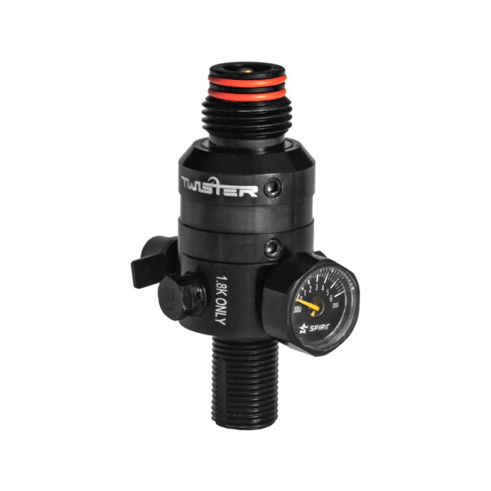 De output pressure is verstelbaar van 460 tot 820 PSI via de meegeleverde shims en staat standaard ingesteld op 560 PSI. De unieke Twister 360º rotational bonnet maakt het mogelijk om de positie van de fill nipple en pressure gauge volledig naar wens af te stellen. De regulator is gemaakt van lichtgewicht aircraft-grade aluminium en beschikt over precision-machined onderdelen, dual urethane O-ring seals, safety burst disks (1.8K en 7.5K), een PSI fill gauge en een fill nipple met beschermkap. Elke regulator wordt met de hand geassembleerd en individueel getest voor kwaliteit en betrouwbaarheid.